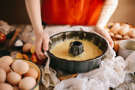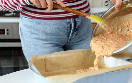 Midsection image of woman pouring cake batter in pan. Person cooking and baking in kitchen at home.