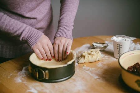 Ingredients for baking cake stuffed with fresh pie. Female preparingpie. Rustic dark style. See series recipe step on step. Womans hands. Recipe for homemade pie on short pastry