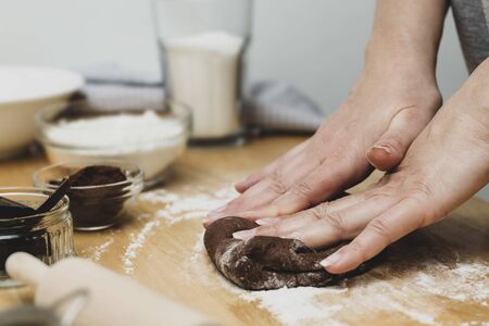 Woman hands kneading chocolate dough, cooking cookies or dessert. Cooking at home, cookies recipe.