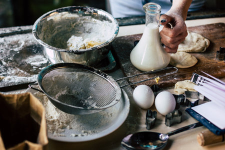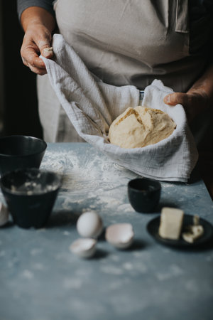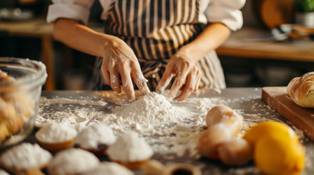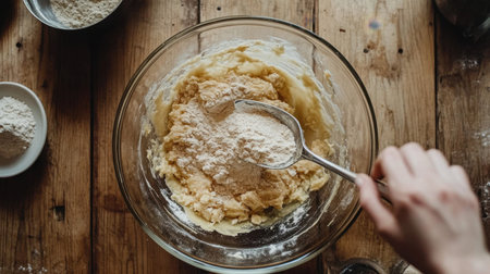 A person enjoys the art of baking in a sunny kitchen, skillfully mixing dough with fresh ingredients, surrounded by a cozy atmosphere and kitchen tools.