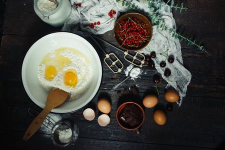 Baking ingredients: flour, eggs, sugar, milk, chocolate, butter, cocoa on dark background