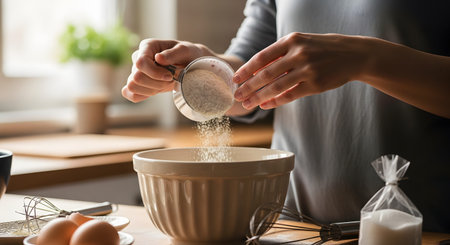 'Close-up partial view of human hand sifting flour above kitchen table
