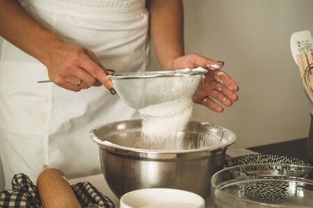 Woman cooks sifting white flour to the bowl. Culinary workshop
