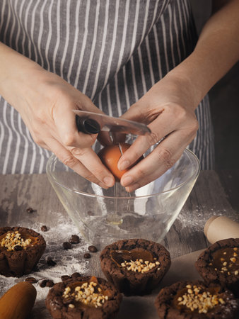 Human hands break eggs into a bowl next to muffins on a table, faceless baker in striped apron, vertical image. Process, cooking, baking, homemade food, tradition, pastry, kitchen concept.