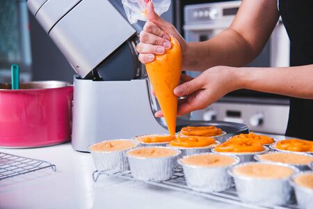 Woman cooking cupcakes in kitchen