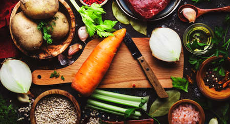 Food cooking background. Fresh organic vegetables, ingredients, spices and meat for warm autumn soup on vintage kitchen table with rustic wooden cutting board. Top view, place for text. Domestic cooking and eating concept