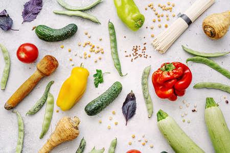 Tasty appetizing farm organic vegetables with healthy grocery on light background. Healthy eating concept. Top View