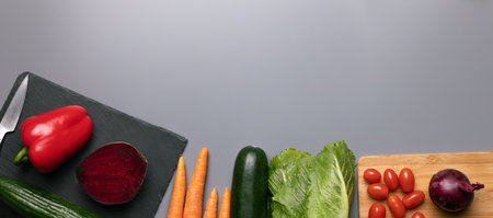 Healthy vegetables on a gray background with copy space. Banner Online shop concept.