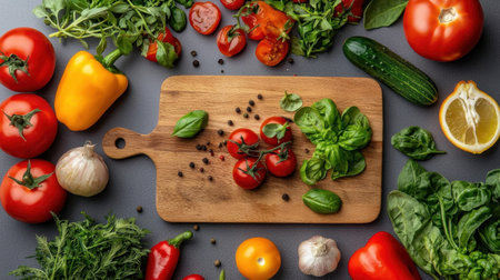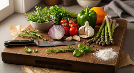 A colorful arrangement of fresh vegetables and herbs on a wooden cutting board, perfect for a vibrant culinary scene in the kitchen.