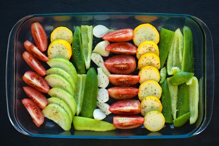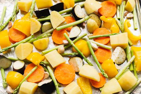 Fresh vegetables for roasting on baking tray