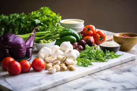 Vegetables and greens laid out for salad, vegetarian food preparation. low-calorie diet menu, vitamins from products Generative AI
