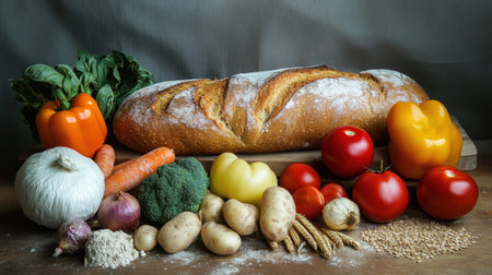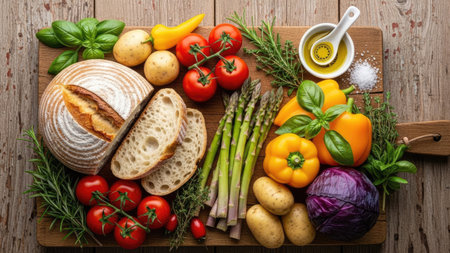 A vibrant assortment of fresh vegetables and bread slices are displayed on a wooden cutting board. The composition features tomatoes, bell peppers, asparagus, and bread. Warm lighting and a close-up perspective create a visually appealing arrangement, suitable for culinary or healthy lifestyle themes. It can be used for various commercial projects.