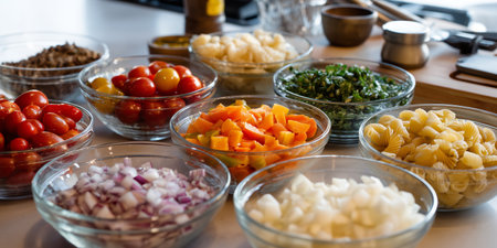 Overhead shot of colorful ingredients arranged neatly on a kitchen counter, ready to be transformed into a delicious meal