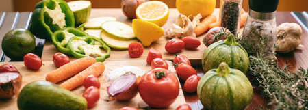 Vegetarian raw healthy green fresh organic food red diet vegetables table wooden vegan