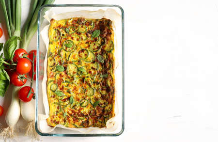 Food concept. Oven baked omelette with zucchini, leeks and cheese isolated on white background. Top view