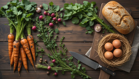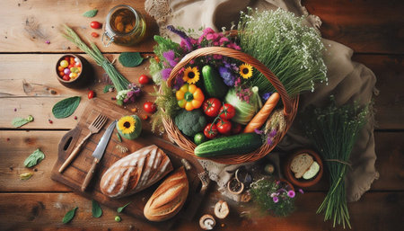 A rustic food display with fresh vegetables, bread, and herbs arranged on a wooden table in soft natural lighting.