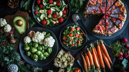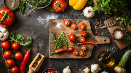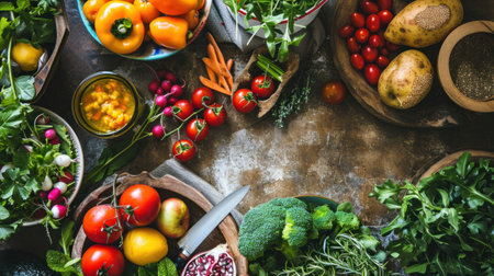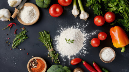A vibrant arrangement of fresh vegetables, herbs, and spices on a dark surface, showcasing the essence of culinary preparation and cooking creativity.