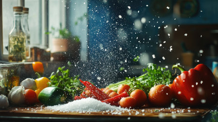 A vibrant kitchen scene with fresh vegetables being seasoned with salt, capturing the joy of cooking and the essential role of salt in enhancing flavors.