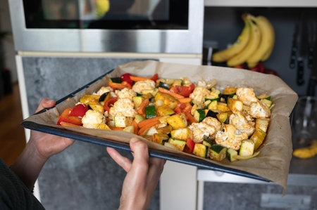 Baked vegetables on tray held by caucasian male in kitchen setting.