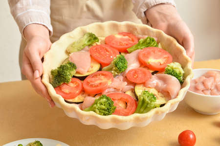 Woman preparing chicken pot pie with vegetables on light background