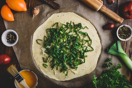 Rolled dough with grated parmesan cheese and sleced leek for preparing galette