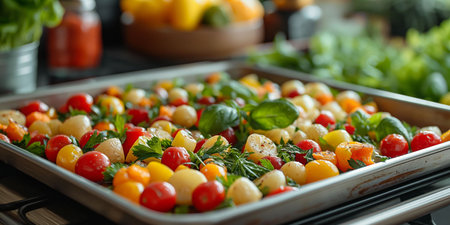 A tray of colorful vegetables for cooking, including cherry tomatoes, basil, ready for cooking, set in a busy kitchen, highlighting a healthy vegetarian meal preparation. High quality photo