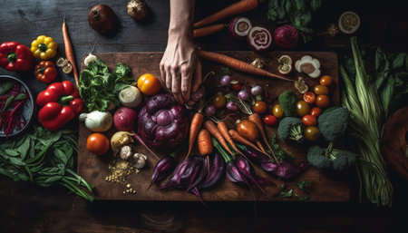 Fresh organic vegetables on rustic wooden cutting board, perfect for cooking generated by artificial intelligence
