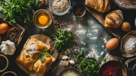 Assorted baking ingredients and fresh pastries on a dark surface