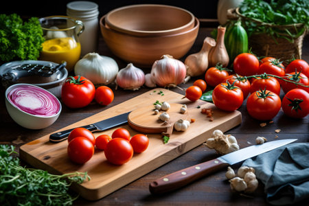Cutting board with varied vegetables in a well-organized kitchen., generative AI