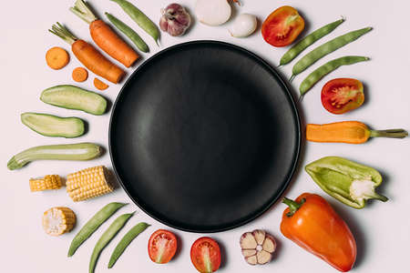Creative layout made of haricot, tomatoes, pepper, carrot, garlic, corn, zucchini, onion and black plate. organic food background. Flat lay, top view, copy space. healthy eating concept