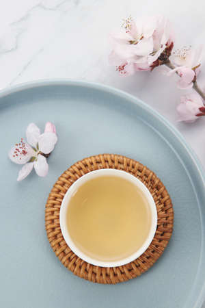 Traditional Chinese tea with blooming plum branches on light background with space for text
