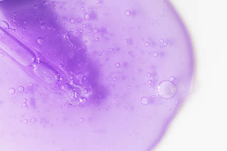 Hyaluronic acid texture, cosmetic product closeup with tiny bubbles. Glycerin or gel smear smudge swatch on lilac backdrop with shadow. Styling gel, lotion, cleanser, transparent shampoo drop. Macro