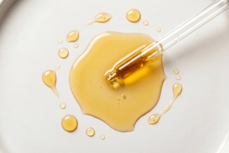 Crystal clear glass dropper submerged in a puddle of golden yellow cosmetic oil, captured from directly above, emphasizing skincare and beauty products