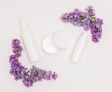 Cream in white bottles and a jar on a white background and lilac flowers. Skin care, health care, spa