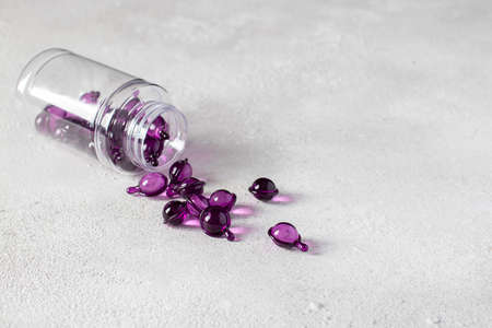 Hair Vitamin Capsules Pour Out of the Bottle on a Gray Background: Hair Treatment and Care Products With Oil for Damaged, Highlighted, Permed and Colored Hair