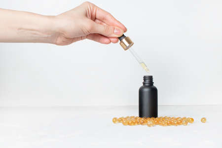 female hand hold pipette and drop oil to black Cosmetic bottle where near cod-liver oil on white background.