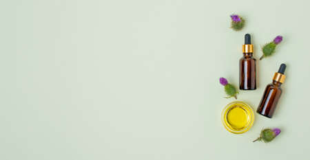 Flat lay of cosmetic glass brown bottles with dropper, burdock flowers and oil on mint background. Place for text