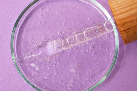 Pipette from dropper with wooden cover lies in the petri dish with cosmetics gel,closeup.Top view,liquid cosmetic,macro photography.Lilac banner with copy space.