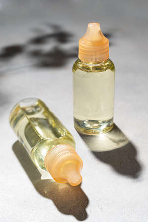 Liquid face serum in a glass bottles with a dropper. Essence of skin care for health and beauty. Copy space