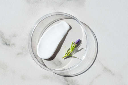 White cosmetic face cream or body lotion moisturizer strokes on marble background in petri dish. Hygiene, skincare product with creamy texture. Beauty face creme smear swatch with flower.