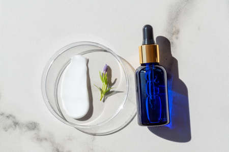 Cosmetic products, cream, face serum and gel in petri dishes on a marble background. Cosmetics laboratory research concept.