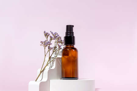 Pump amber glass cosmetic bottle with cream or fluid for skin care on white concrete podium on pink background. natural skincare concept