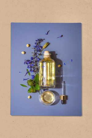 One bottle with natural cosmetic aroma oil on a blue background in flowers. Flat lay, concept of natural organic cosmetics for skin care