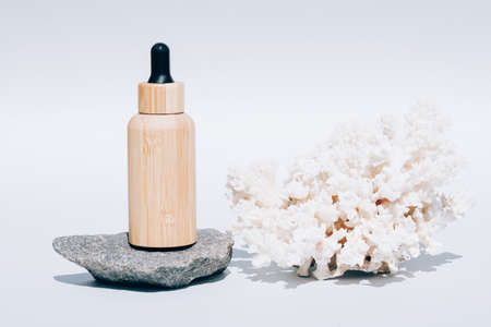 Cosmetic oil with natural Dead Sea minerals in wooden dropper bottle against white background with sea corals. Algae oil or sea minerals based cosmetics products for skin care. Mockup image