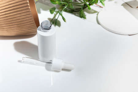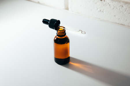 Open amber bottle with pipettte on a white table with face serum products. Glass bottle with self care product. Front view
