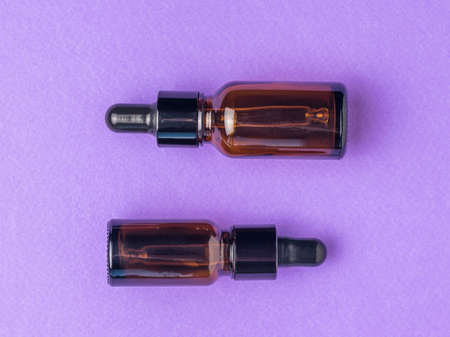 Two medical bottles with a pipette on a purple background. The concept of treatment and body care using natural remedies. Flat lay.