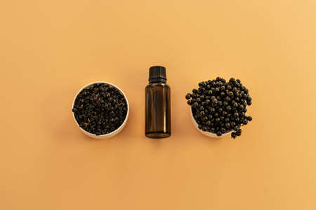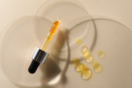 A bottle of essential oil with a glass pipette on a beige background. Natural skin care cosmetics.