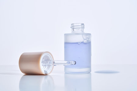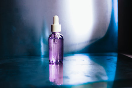 A serum bottle with purple liquid and a dropper, reflecting on a surface with blue highlights. A sleek, minimalist image of a serum bottle with a dropper, featuring a beautiful, purple-hued liquid inside and reflections.