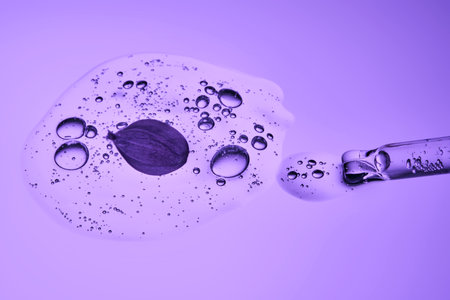 Pipette with serum on purple background with sunlight.