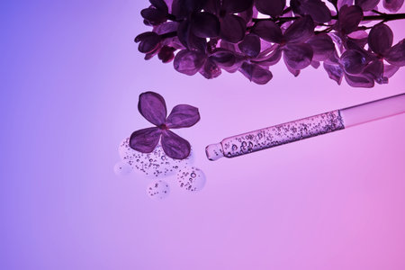 A pipette with cosmetic serum and lilac petals.